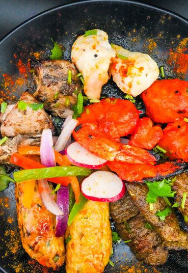 Dish is marinated meats and seafood, grilled to with smoky flavors from traditional Indian spices.
